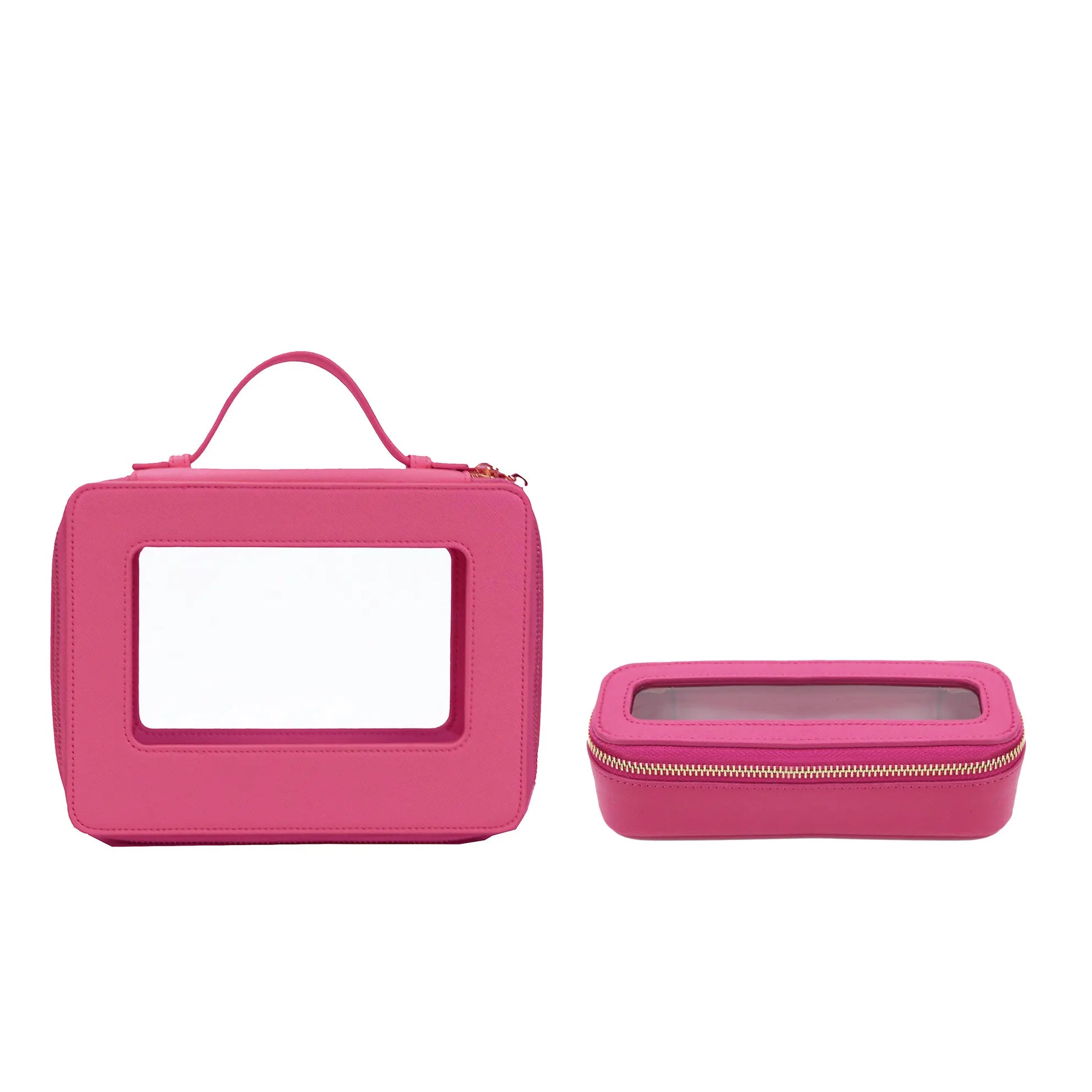 Custom Genuine Leather Travel Cosmetic Bag Set Colorful Classic Saffiano Portable Travel Clear PVC Cosmetic Bag TPU Wash Bag